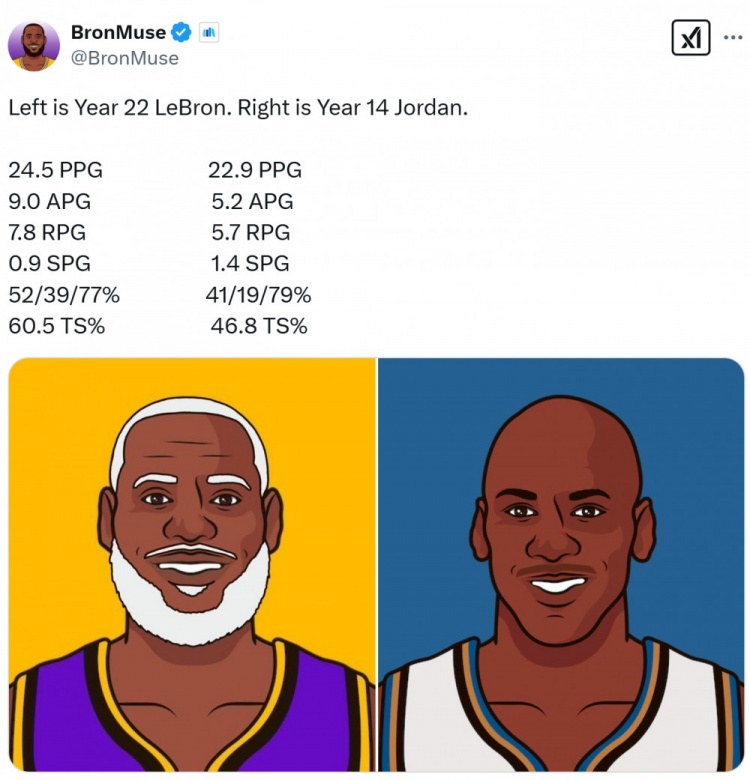 詹姆斯生涯第22季場(chǎng)均24.5分7.8籃板9助攻0.9搶斷,三項(xiàng)命中率52/39/77%,真實(shí)命中率60.5%;喬丹生涯第14季場(chǎng)均22.9分5.7籃板5.2助攻1.4搶斷,三項(xiàng)命中率41/19/79%,真實(shí)命中率46.8%。 本文標(biāo)簽: 籃球 NBA 湖人 詹姆斯 喬丹