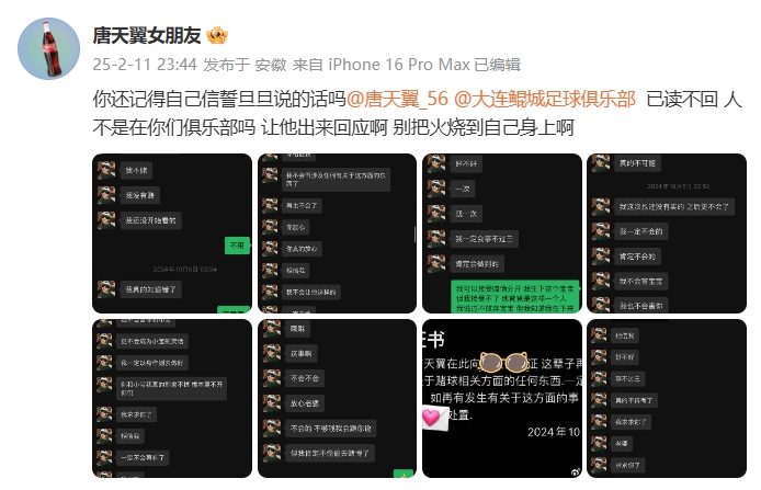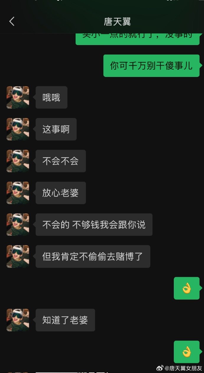 名為“唐天翼女朋友”的微博賬號再曝聊天記錄,唐天翼曾向這位女友做出“保證書”,保證這輩子再也不沾油管賭球相關(guān)的任何東西。