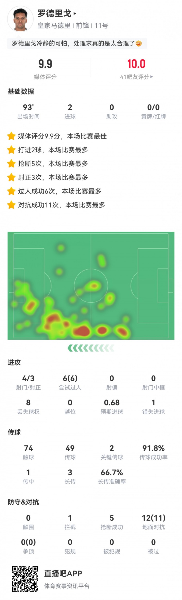 1月30日訊 歐冠末輪,皇馬3-0客勝布雷斯特。此役羅德里戈發(fā)揮出色雙響建功,多項數(shù)據(jù)全場最高。球員全場重點數(shù)據(jù)如下↓