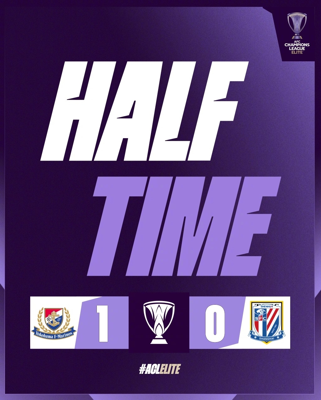 傷停補(bǔ)時(shí)2分鐘。上半場比賽結(jié)束,上海申花0-1橫濱水手。