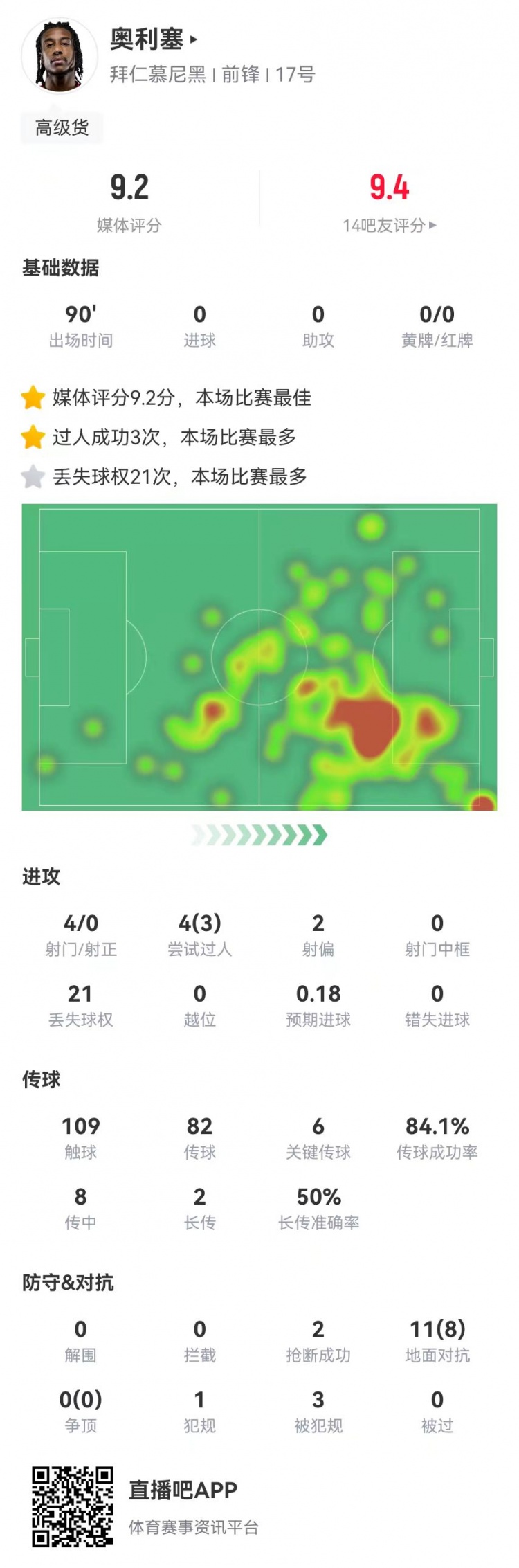 1月30日訊 拜仁在本輪歐冠3-1擊敗布拉迪斯拉發(fā),奧利塞本場(chǎng)數(shù)據(jù)如下: