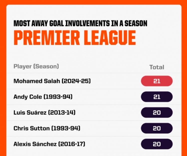 2月12日訊 Opta統(tǒng)計了球員單賽季在英超客場比賽中參與進球的數(shù)量,并列出榜單,本賽季薩拉赫參與21球(13球8助),與科爾并列排名首位。單賽季英超客場參與進球榜:薩拉赫(2024-2025)——21安迪-科爾(1993-1994)——21蘇亞雷斯(2013-2014)——20薩頓(1993-1994)——20桑切斯(2016-2017)——20 本文標簽: 足球 英超 利物浦 薩拉赫