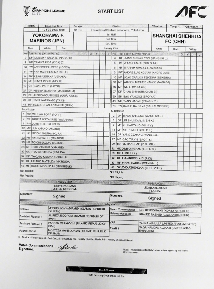 2024/25亞冠精英聯(lián)賽第7輪 橫濱水手 vs 上海申花 首發(fā)名單