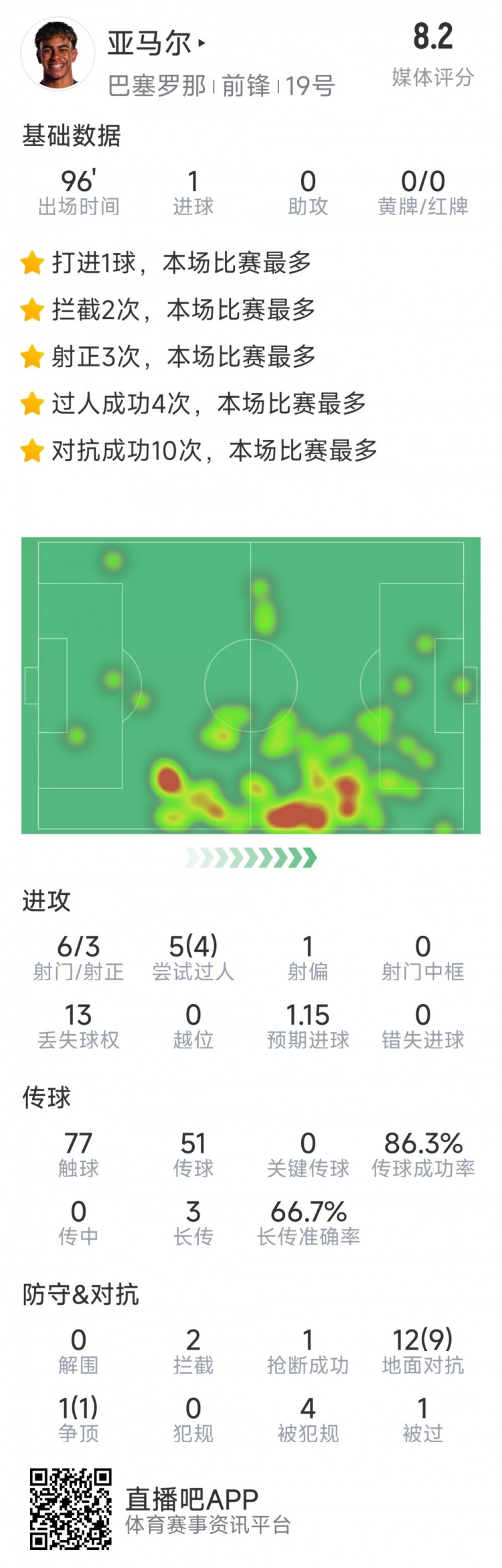 1月30日訊 在本輪歐冠,巴薩2-2戰(zhàn)平亞特蘭大,亞馬爾打進一球,以下為他在本場數據:比賽時間90分鐘1粒進球6射3正5次過人4次成功77次觸球傳球成功率86.3%2次攔截1次搶斷13次對抗10次成功sofa評分8.2分 本文標簽: 足球 西甲 巴塞羅那
