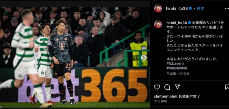 2月13日訊 歐冠淘汰賽附加賽首回合,拜仁客場(chǎng)2-1擊敗凱爾特人,取得晉級(jí)先機(jī)。比賽第78分鐘,傷缺半年的伊藤洋輝替補(bǔ)登場(chǎng),上演拜仁首秀。