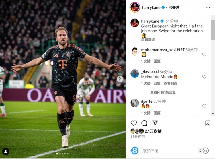 2月13日訊 歐冠淘汰賽附加賽首回合比賽,凱恩取得進(jìn)球,幫助拜仁客場(chǎng)2-1擊敗凱爾特人。凱恩賽后在社交媒體上曬出慶祝進(jìn)球的照片,配文:“美妙的歐冠之夜,任務(wù)完成了一半,滑動(dòng)屏幕看我的慶祝?!?/p> 本文標(biāo)簽: 足球 德甲 拜仁慕尼黑 凱恩 歐冠