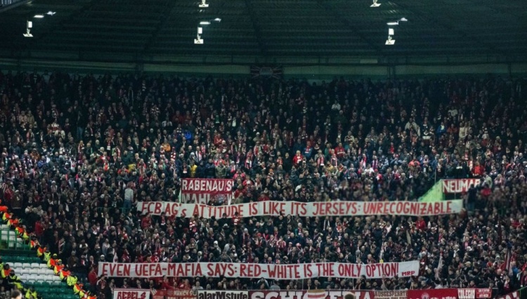 本場比賽拜仁球員身穿黑色客場球衣,拜仁球迷在看臺上掛出橫幅:“拜仁股份公司(FCB AG)的態(tài)度就像它的球衣——不可識別。即使歐足聯(lián)-黑手黨也說:紅白球衣是唯一的選擇。”