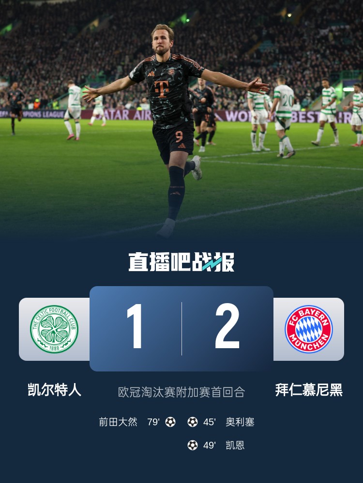 歐冠淘汰賽附加賽首回合,奧利塞、凱恩破門,拜仁2-1凱爾特人。