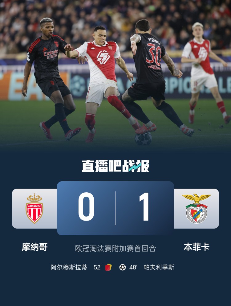 歐冠淘汰賽附加賽首回合,本菲卡客場(chǎng)1-0摩納哥,帕夫利季斯制勝。