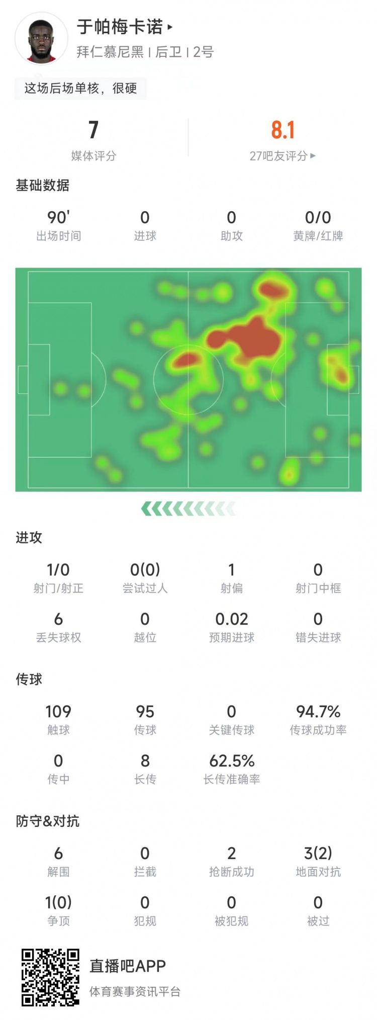 于帕梅卡諾本場比賽數(shù)據(jù):