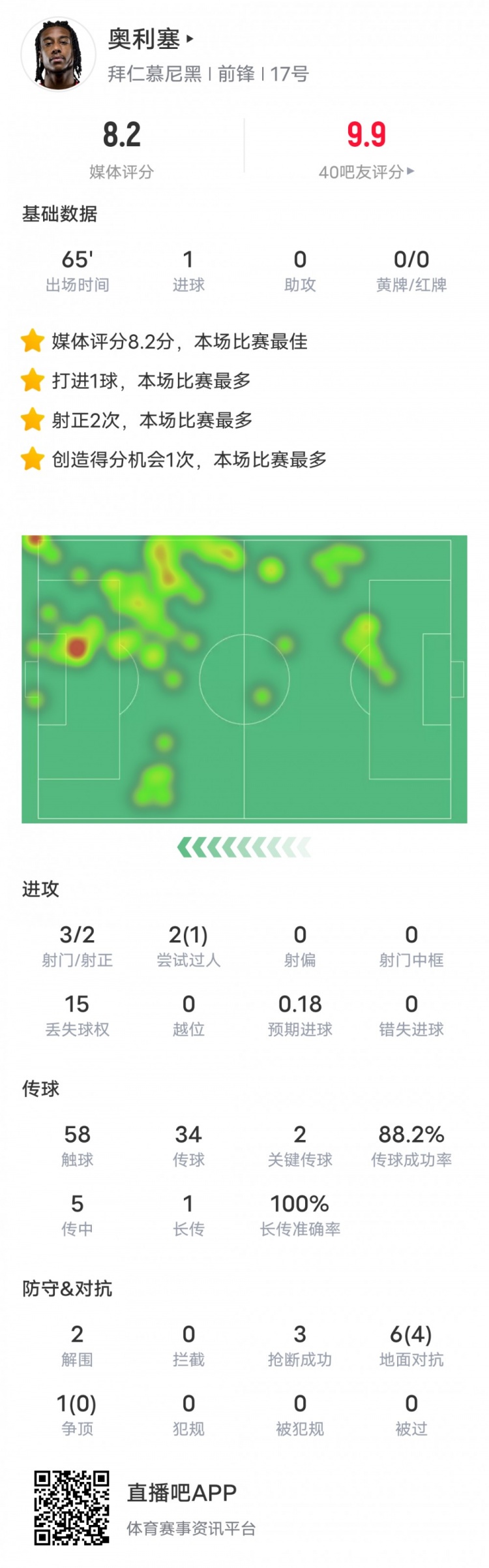 奧利塞本場(chǎng)比賽數(shù)據(jù)如下: