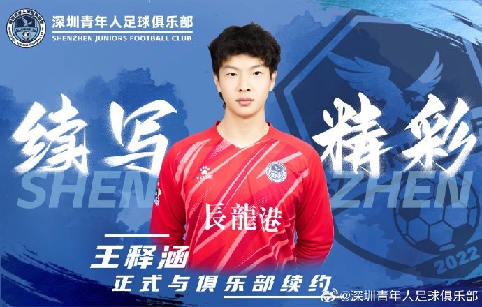 王釋涵今年20歲,司職門(mén)將,球員去年年初從上海申花轉(zhuǎn)會(huì)深圳青年人,此次順利續(xù)約。