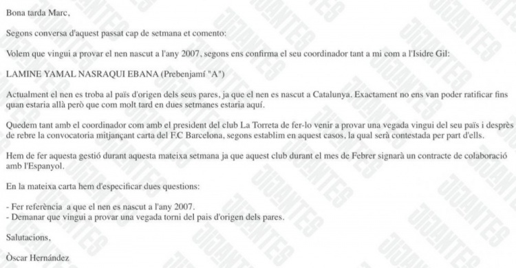 2015年,奧斯卡-埃爾南德斯(不是哈維的弟弟,同名)當(dāng)時(shí)擔(dān)任巴薩青訓(xùn)幼兒組協(xié)調(diào)員。在近日接受Jijantes采訪時(shí),奧斯卡-埃爾南德斯披露了一份郵件,亞馬爾7歲時(shí)曾很有可能加入西班牙人。