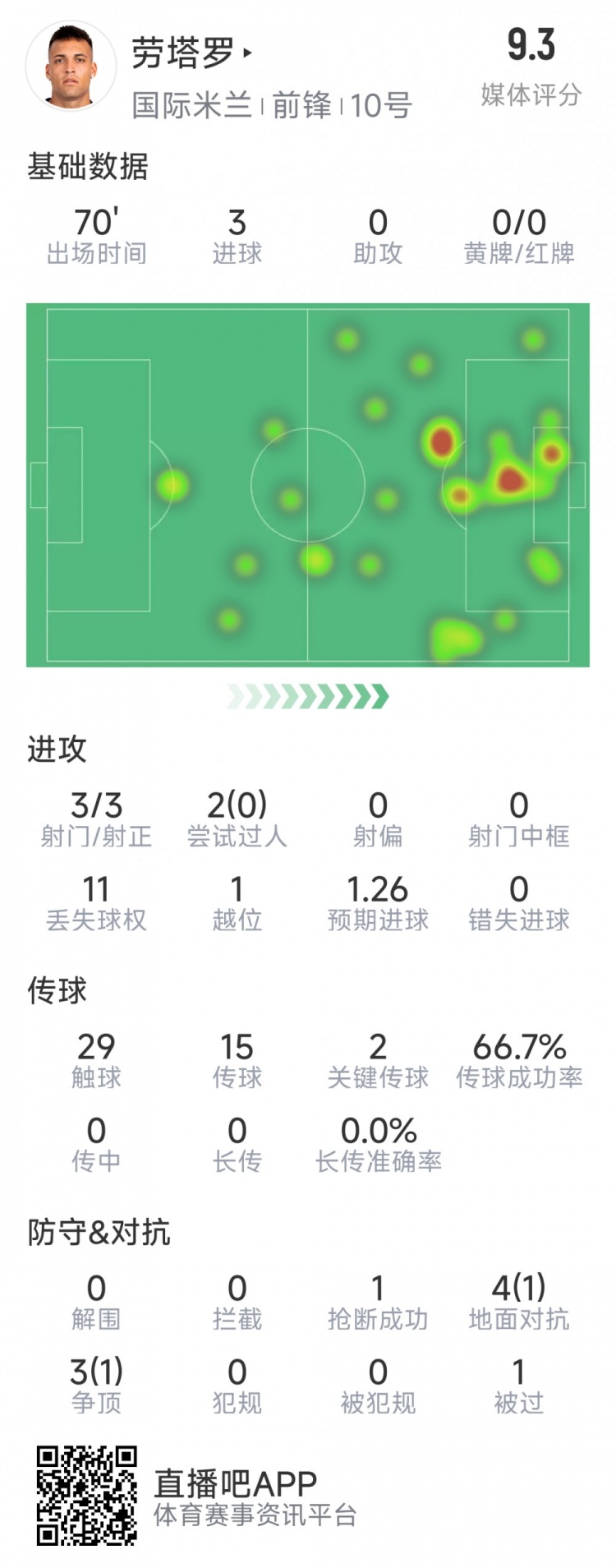 1月30日訊 在本輪歐冠國(guó)米對(duì)陣摩納哥的比賽中,勞塔羅上演帽子戲法,以下為他在本場(chǎng)數(shù)據(jù):