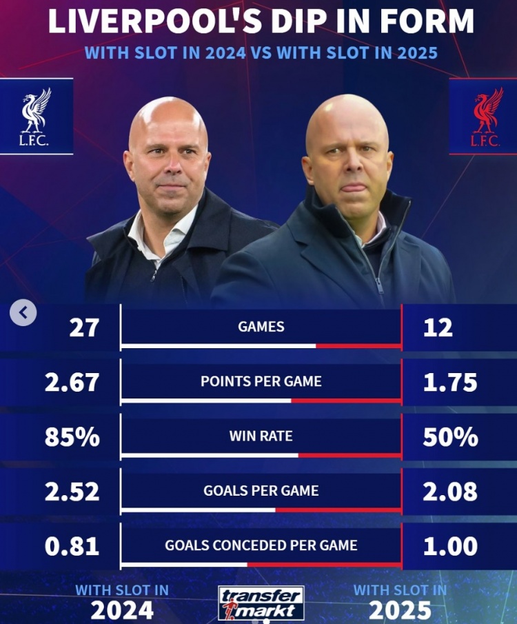 2月14日訊 利物浦在本輪英超2-2被埃弗頓絕平,《轉(zhuǎn)會(huì)市場(chǎng)》也對(duì)比了斯洛特帶領(lǐng)利物浦在去年和今年的各項(xiàng)賽事戰(zhàn)績(jī)情況。