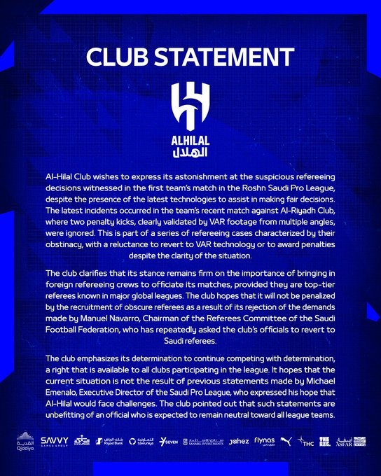 俱樂部的立場(chǎng)仍然堅(jiān)定,即引進(jìn)外國(guó)裁判人員來執(zhí)行比賽的重要性,前提是他們是在全球主要聯(lián)賽中知名的頂級(jí)裁判。俱樂部希望不會(huì)因?yàn)榫芙^了沙特足協(xié)裁判委員會(huì)主席曼努埃爾-納瓦羅的要求而受到不知名裁判執(zhí)法比賽的懲罰。納瓦羅曾多次要求俱樂部官員恢復(fù)使用沙特裁判,但俱樂部強(qiáng)調(diào)了其決心,這是所有參加聯(lián)賽的俱樂部都享有的權(quán)利。