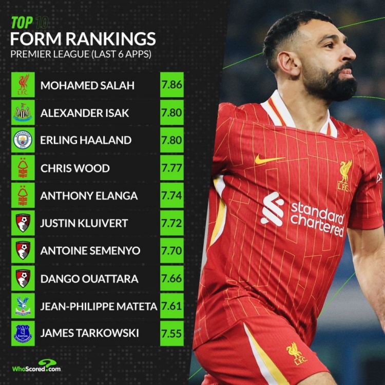2月15日訊 數(shù)據(jù)結(jié)構(gòu)whoscored統(tǒng)計(jì)了近6場(chǎng)英超場(chǎng)均評(píng)分情況,薩拉赫重返榜首。