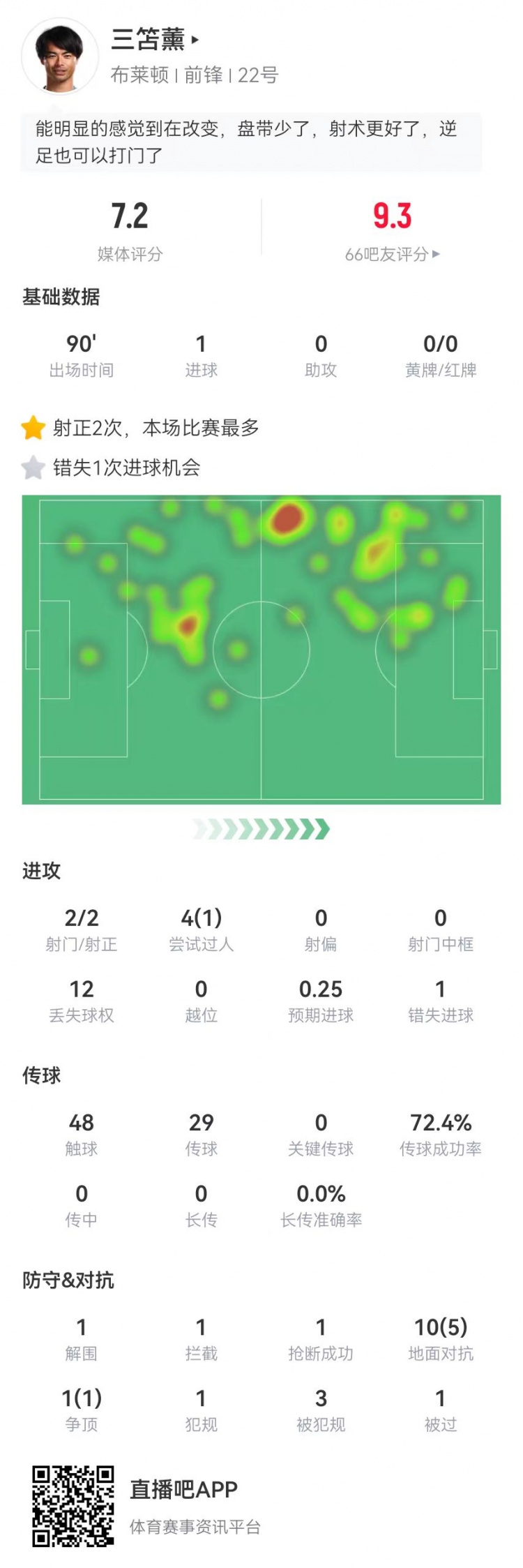 2月15日訊 布萊頓在本輪英超3-0完勝切爾西,三笘薰本場(chǎng)數(shù)據(jù)如下: