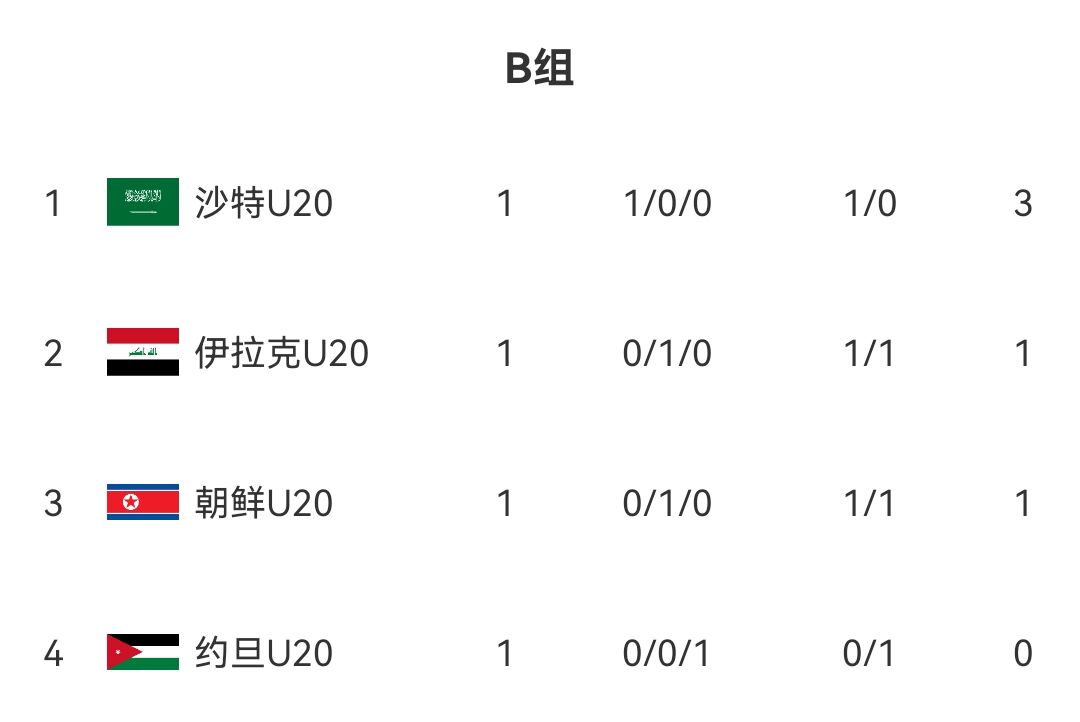 在8強(qiáng)戰(zhàn)中,國(guó)足所在的A組前二將與B組前二交叉對(duì)陣,目前B組僅進(jìn)行了一輪比賽,沙特U20暫居第一。