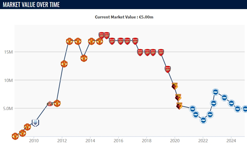 維爾貝克現(xiàn)年34歲,出自曼聯(lián)青訓(xùn),球員在2014年以2000萬歐元轉(zhuǎn)會費轉(zhuǎn)投阿森納。維爾貝克在2019年自由身轉(zhuǎn)會至沃特福德后,布萊頓于2020年10月將其簽下,并效力至今。本賽季這位英格蘭前鋒代表球隊英超出場19次,打進6球并有4次助攻。目前球員德轉(zhuǎn)身價為500萬歐元。