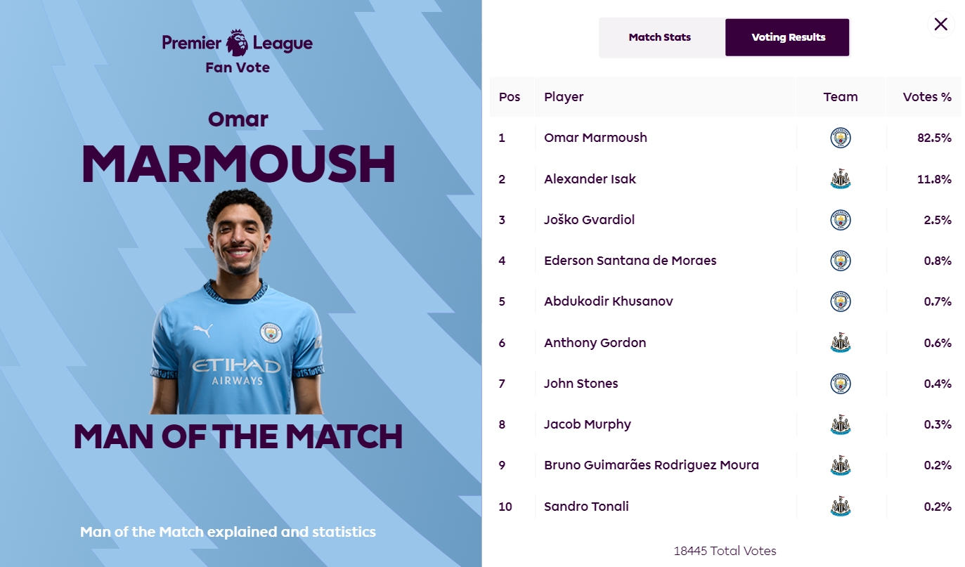 英超官方賽后宣布,馬爾穆什被球迷票選為本場比賽全場最佳,得票率高達(dá)82.5%。