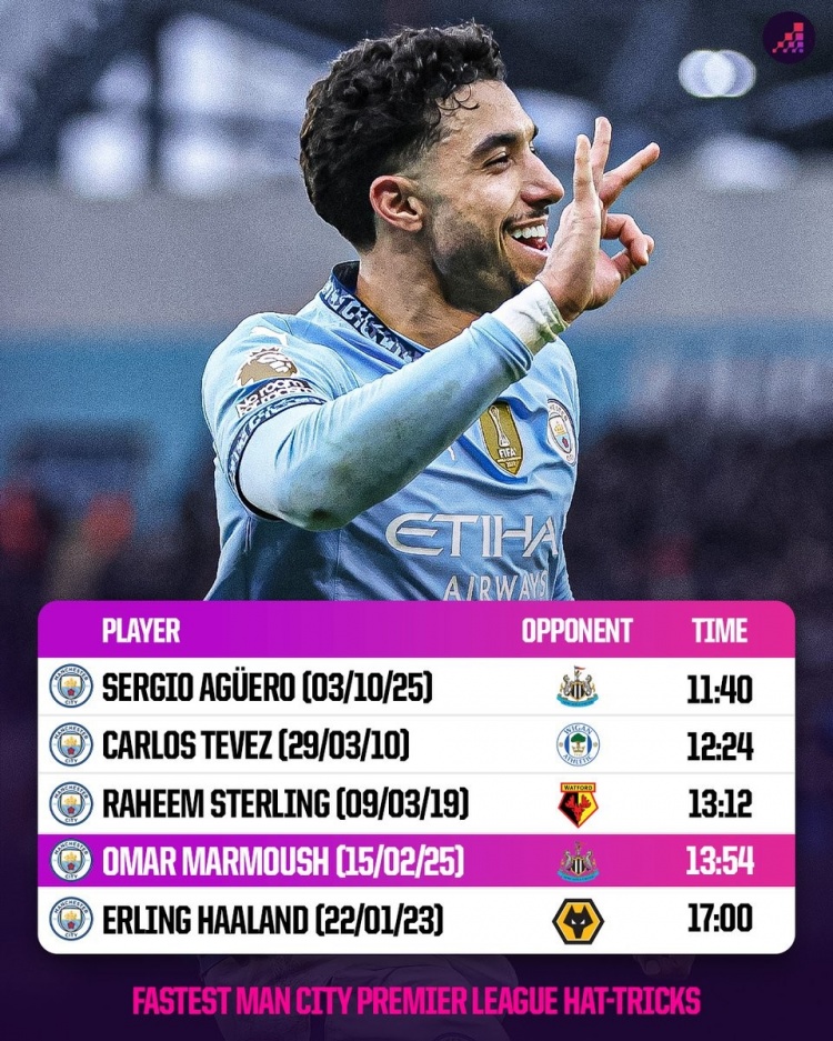 2月16日訊 曼城在本輪英超3-0領(lǐng)先紐卡,馬爾穆什上半場戴帽,數(shù)據(jù)統(tǒng)計(jì)顯示他3粒進(jìn)球間隔僅13分54秒。