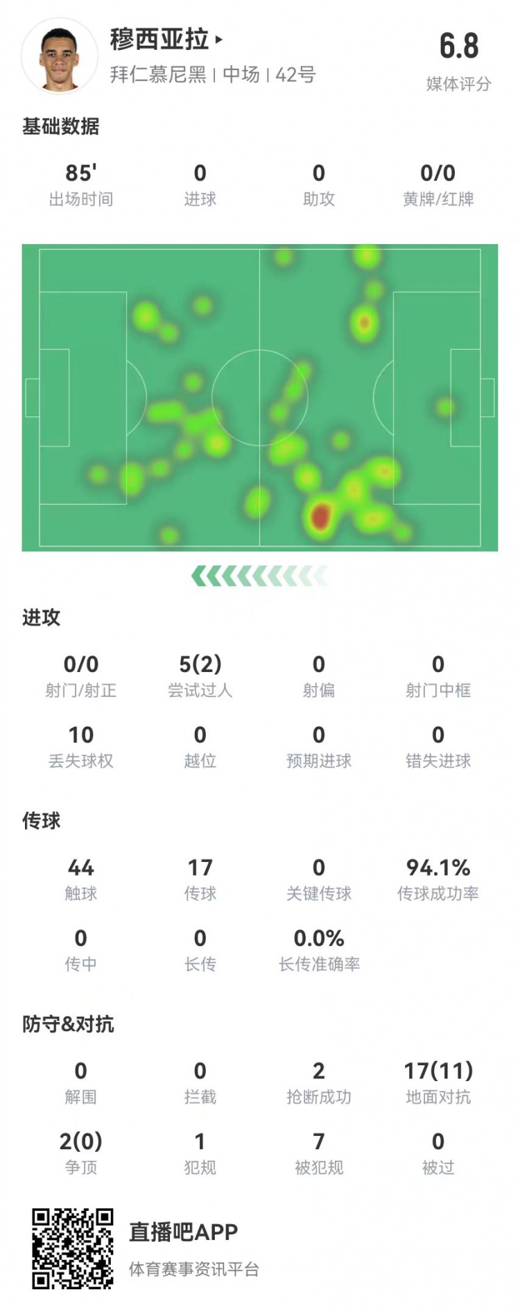 2月16日訊 拜仁在本輪德甲客場0-0暫時(shí)戰(zhàn)平勒沃庫森,剛剛頂薪續(xù)約的穆西亞拉本場數(shù)據(jù)如下: