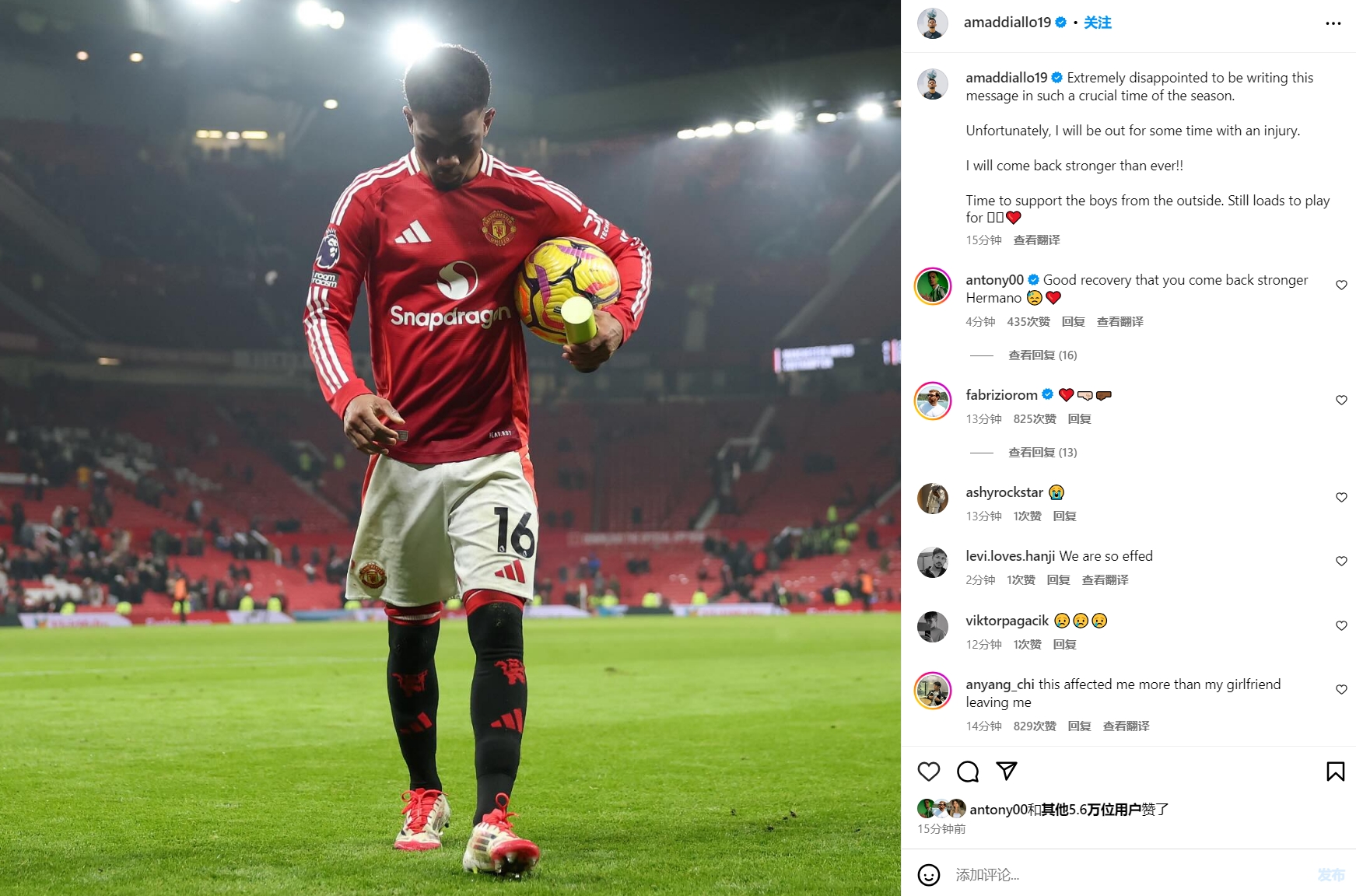 曼聯(lián)外租球員安東尼也安慰阿瑪?shù)拢盒值?,祝你康?fù)過程一切順利,希望復(fù)出時你能更加強大。