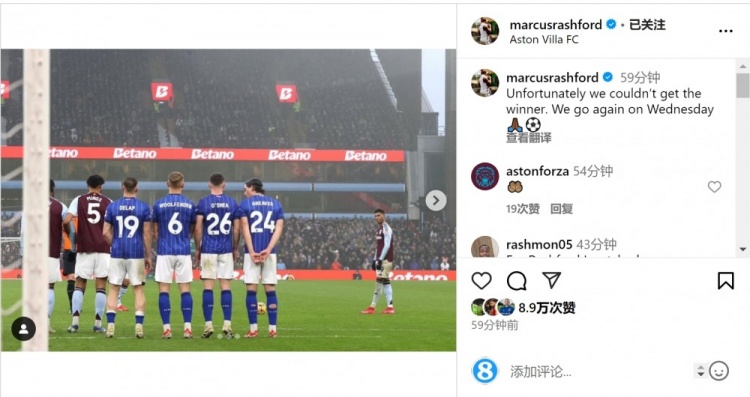 2月16日訊 英超第25輪比賽,維拉主場1-1戰(zhàn)平伊普斯維奇。此役拉什福德為維拉替補出場,他主罰任意球擊中橫梁,隊友沃特金斯補射破門。拉什福德賽后在社交媒體上曬出自己主罰任意球的照片,配文:“很遺憾我們未能攻入制勝球,下周三我們繼續(xù)加油(對陣?yán)锲郑?。?/p> 本文標(biāo)簽: 足球 英超 阿斯頓維拉