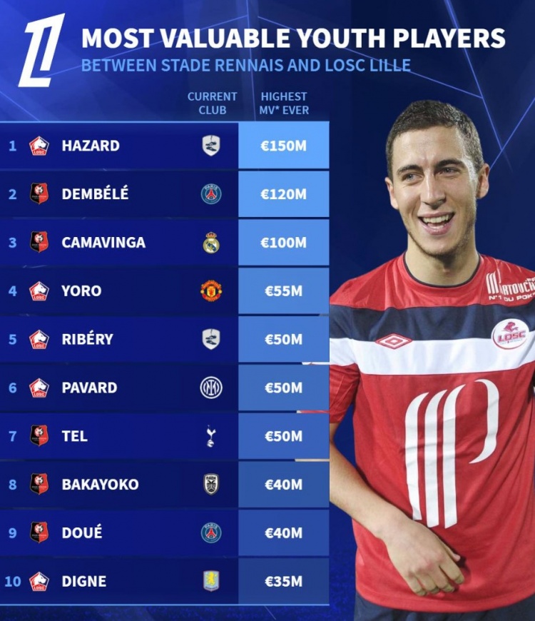 2月17日訊 《轉(zhuǎn)會(huì)市場(chǎng)》統(tǒng)計(jì)了里爾和雷恩兩家俱樂(lè)部培養(yǎng)的青訓(xùn)球員歷史身價(jià)最貴榜單,阿扎爾居首。