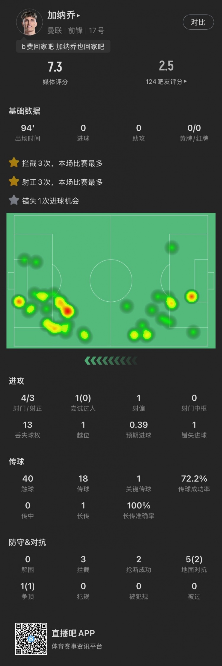 2月17日訊 在剛剛結(jié)束的英超本輪焦點(diǎn)戰(zhàn)中,曼聯(lián)0-1不敵熱刺。本場(chǎng)比賽,加納喬打滿(mǎn)全場(chǎng)但表現(xiàn)欠佳,獲評(píng)7.3分。