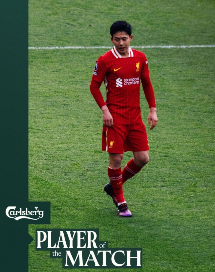 2月17日訊 英超第25輪,利物浦2-1擊敗狼隊(duì),7分優(yōu)勢領(lǐng)跑積分榜。賽后,替補(bǔ)登場的遠(yuǎn)藤航當(dāng)選了紅軍隊(duì)內(nèi)最佳球員。