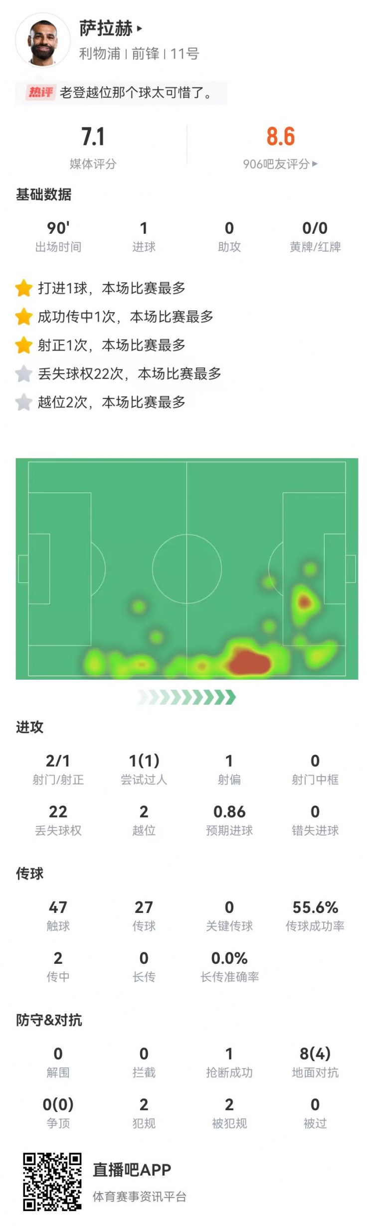 2月17日訊 利物浦在本輪英超2-1險(xiǎn)勝狼隊(duì),薩拉赫本場(chǎng)數(shù)據(jù)如下: