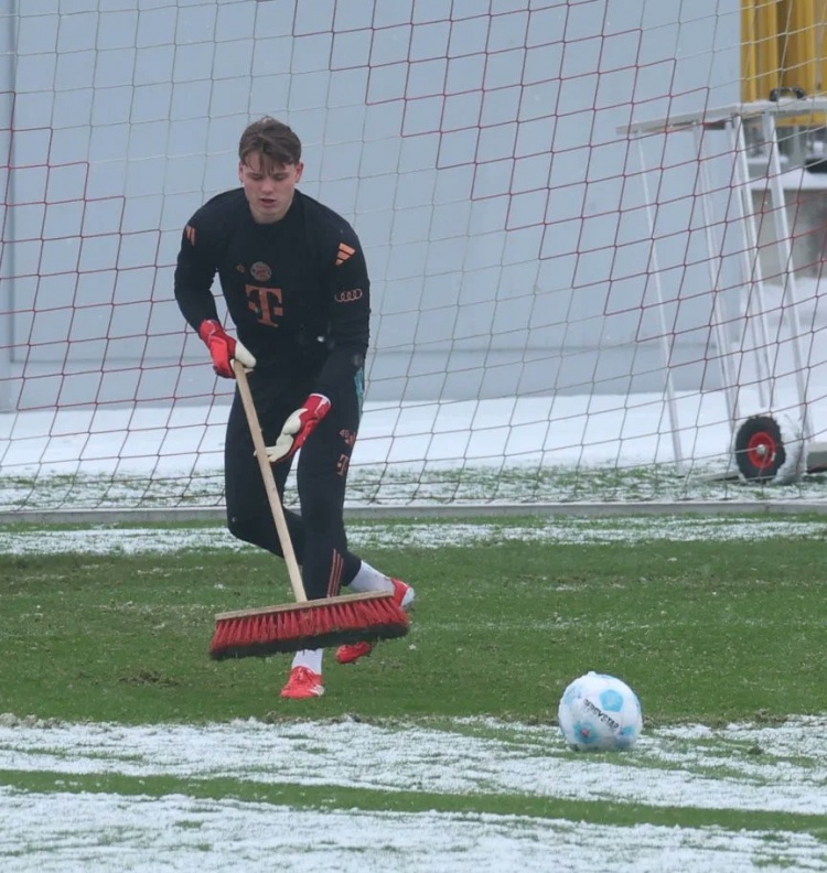 由于慕尼黑周日突降大雪,這位小將并沒有等待工作人員,而是自己拿起掃把和門將教練一起掃雪,隨后加練了一個(gè)小時(shí)。