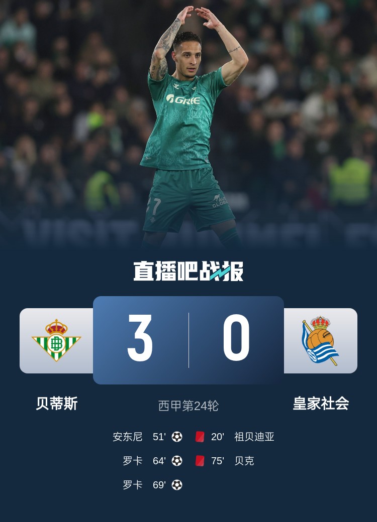 西甲第24輪,貝蒂斯3-0皇家社會(huì),安東尼世界波,羅卡梅開二度。