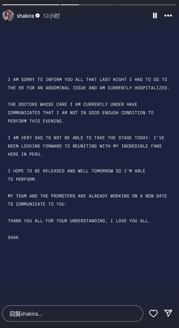 夏奇拉個(gè)人社媒聲明:我很抱歉地通知大家,昨晚因腹部問題我不得不去看醫(yī)生,目前正在住院接受治療。