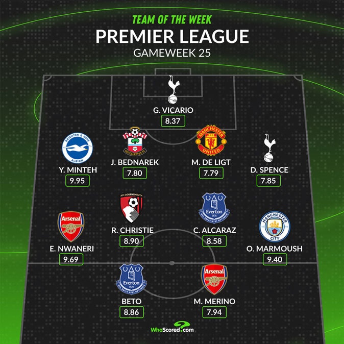 2月17日訊 英超第25輪比賽戰(zhàn)罷,WhoScored列出了本輪最佳陣容,梅里諾、恩瓦內里、馬爾穆什、德里赫特在列。
