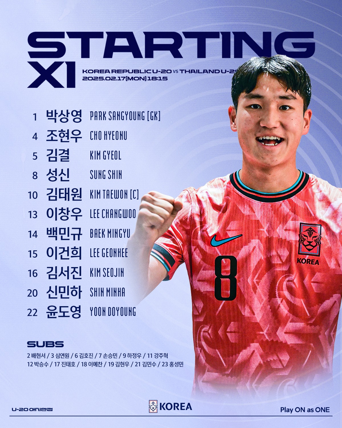 韓國(guó)U20首發(fā):1-樸相英、4-趙賢友、16-金書(shū)真、20-申民河、8-成信、13-李昌友、15-李建熙、22-尹棹泳、5-金杰、金泰元、14-白民奎
