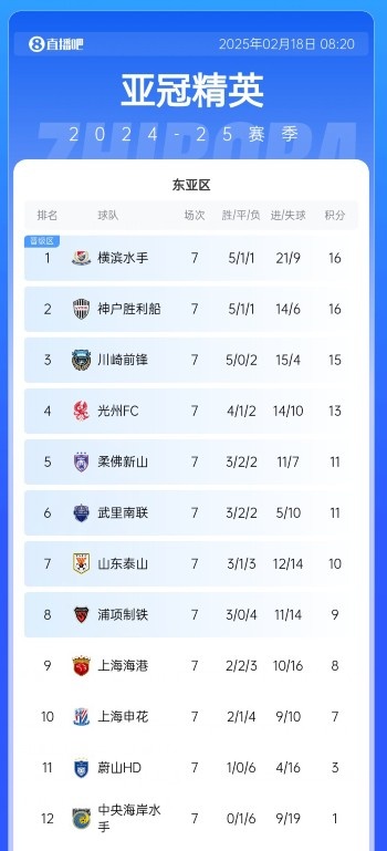 目前在積分榜上,上海申花隊2勝1平4負暫列亞冠精英聯賽東亞區(qū)第10位。