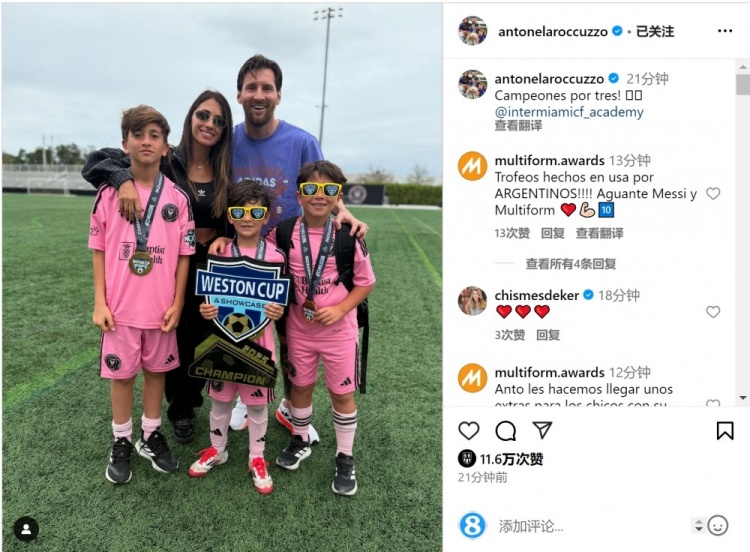 2月18日訊 梅西妻子安東內(nèi)拉更新社媒動(dòng)態(tài),曬出一家的合照。梅西的三個(gè)兒子隨邁阿密國際青訓(xùn)梯隊(duì)參加韋斯頓杯比賽,安東內(nèi)拉社媒曬出一家人的合照,蒂亞戈、馬特奧、西羅均佩戴冠軍獎(jiǎng)牌,配文:“三個(gè)冠軍!” 本文標(biāo)簽: 足球 邁阿密國際 梅西