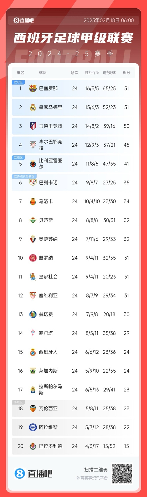 2月18日訊 西甲第24輪,巴塞羅那1-0小勝巴列卡諾,重回西甲榜首,憑借凈勝球優(yōu)勢力壓皇馬。而在第21輪,當(dāng)時(shí)的巴薩還落后皇馬7分,但近3輪皇馬1負(fù)2平僅拿2分,而巴薩則3輪全勝。最新西甲積分榜:第21輪時(shí)的積分榜: 本文標(biāo)簽: 西甲 皇家馬德里 巴塞羅那 足球