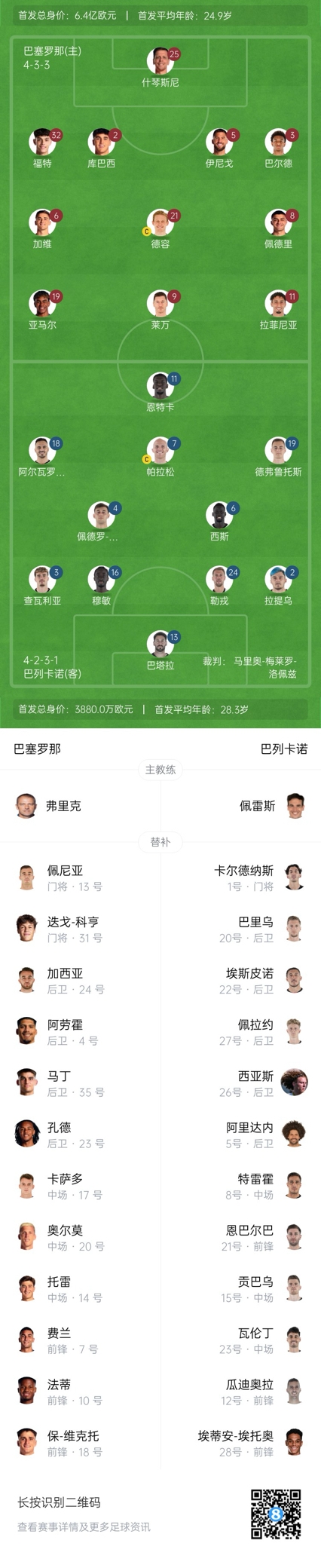 巴薩首發(fā):25-什琴斯尼、2-庫巴西、5-伊尼戈-馬丁內(nèi)斯、3-巴爾德、32-埃克托-福特、6-加維、21-德容、8-佩德里、11-拉菲尼亞、19-亞馬爾、9-萊萬多夫斯基