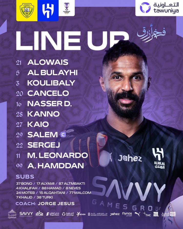 替補:37-布努、17-阿爾米亞、87-坦巴克蒂、4-哈利法-阿爾達薩里、88-哈馬德、8-魯本-內(nèi)維斯、24-哈爾比、15-阿爾卡塔尼、77-馬爾科姆、7-加納姆、38-圖爾克