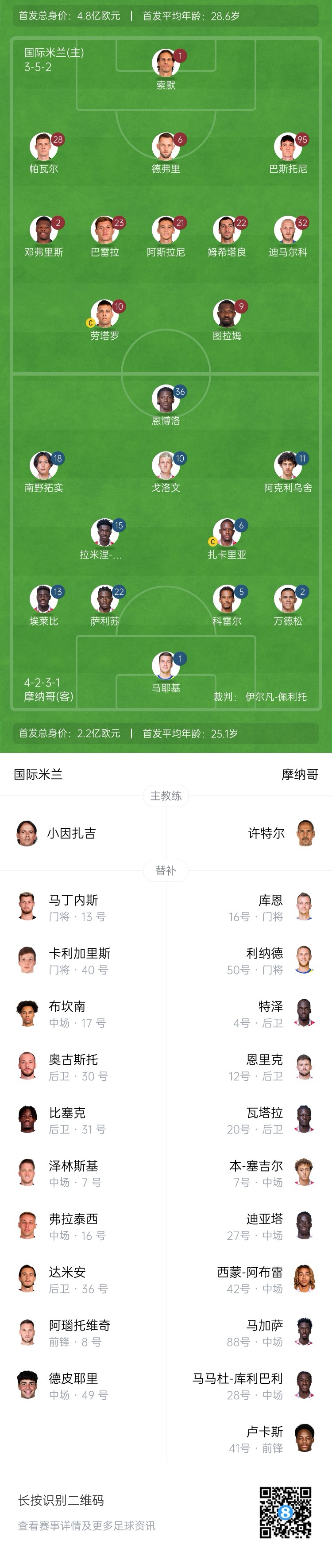 1月30日訊 北京時(shí)間1月30日星期四04:00,歐冠聯(lián)賽階段第8輪,國際米蘭坐鎮(zhèn)主場梅阿查迎戰(zhàn)摩納哥,目前雙方已經(jīng)公布了本場比賽的首發(fā)陣容。