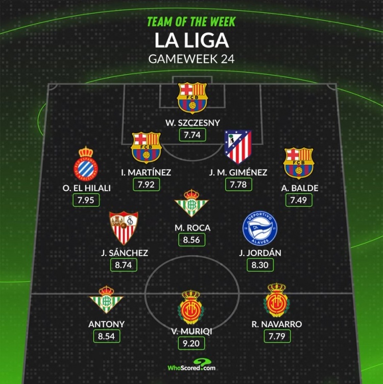 2月18日訊 WhoScored評選出了本輪西甲比賽的最佳陣容,安東尼入選。陣容如下:門將:什琴斯尼(巴薩)后衛(wèi):埃爾-希拉利(西班牙人)、伊尼戈(巴薩)、吉梅內(nèi)斯(馬競)、巴爾德(巴薩)中場:胡安盧-桑切斯(塞維利亞)、羅卡(貝蒂斯)、約爾丹(阿拉維斯)前鋒:安東尼(貝蒂斯)、穆里奇(拉斯帕爾馬斯)、納瓦羅(拉斯?fàn)栺R斯) 本文標(biāo)簽: 足球 西甲 巴塞羅那 塞維利亞 拉斯帕爾馬斯 貝蒂斯 阿拉維斯 西班牙人