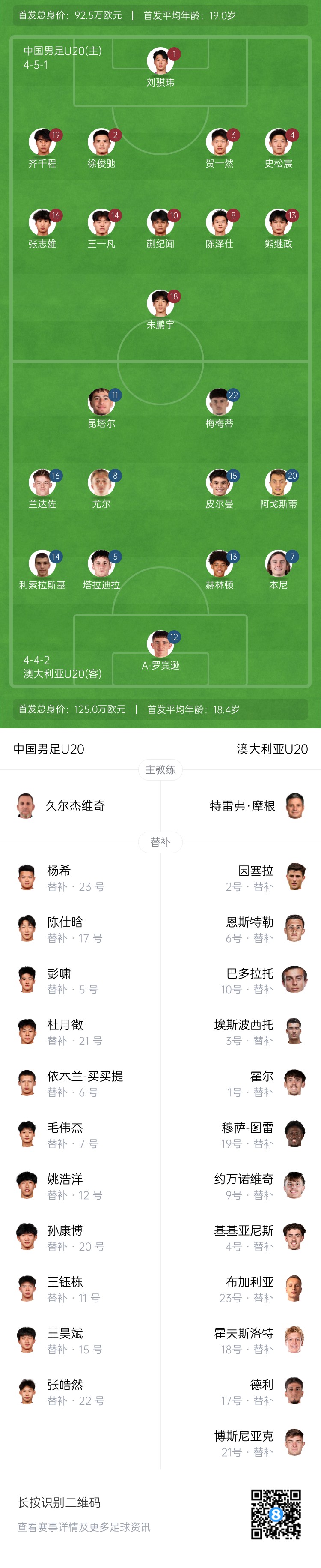 2月18日訊 北京時(shí)間19點(diǎn)30分,U20亞洲杯小組賽A組第三輪,中國(guó)vs澳大利亞,賽前雙方首發(fā)公布!本場(chǎng)比賽劉誠宇因累積黃牌停賽,較上場(chǎng)比賽國(guó)青首發(fā)更換6人,澳大利亞則更換了9人。