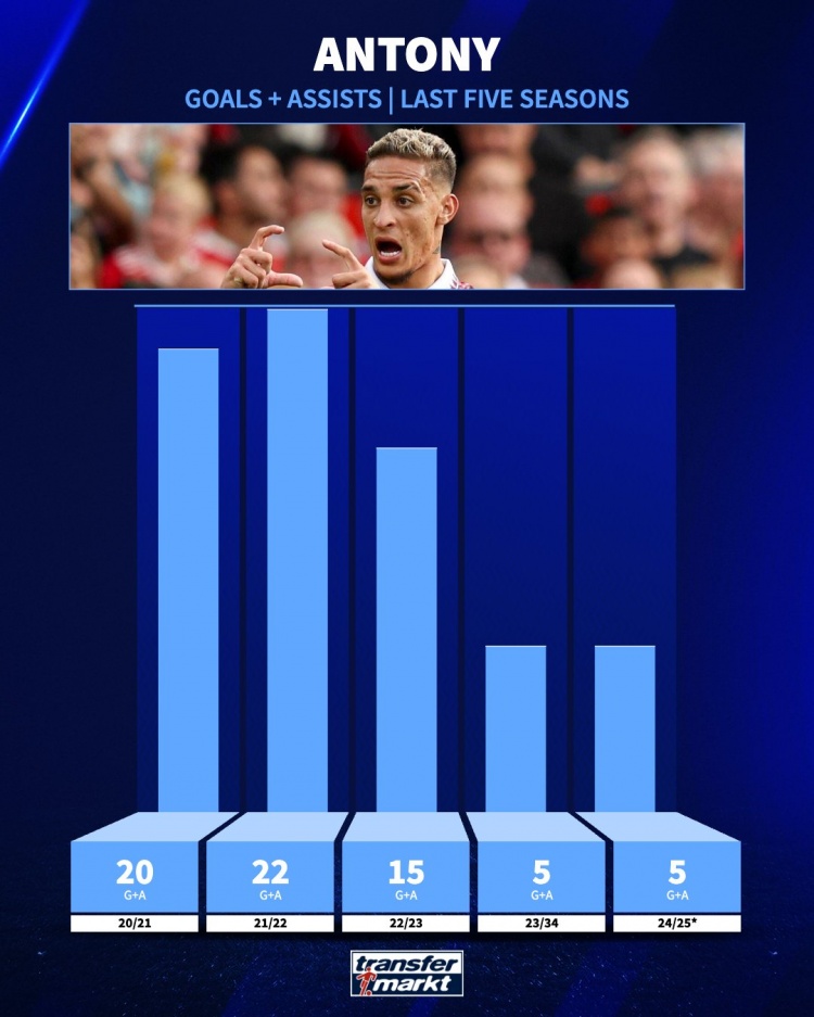 安東尼近5個賽季參與進(jìn)球數(shù)量(所有俱樂部賽事):