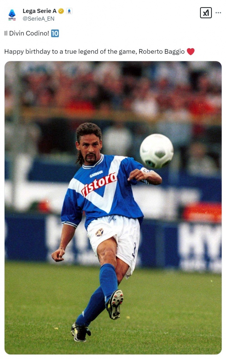 意甲官方社媒曬出巴喬球員時代的照片,配文:“祝真正的足壇傳奇羅伯特-巴喬生日快樂!”