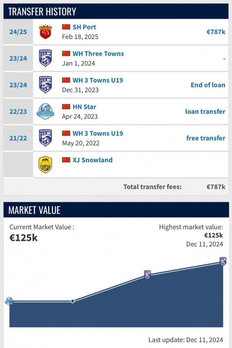 在吾米提江的個人頁面顯示,他已于2月18日加盟上海海港,轉(zhuǎn)會費78.7萬歐元(約合600萬人民幣),不過合同年限暫未披露。目前,吾米提江的個人身價為12.5萬歐元。