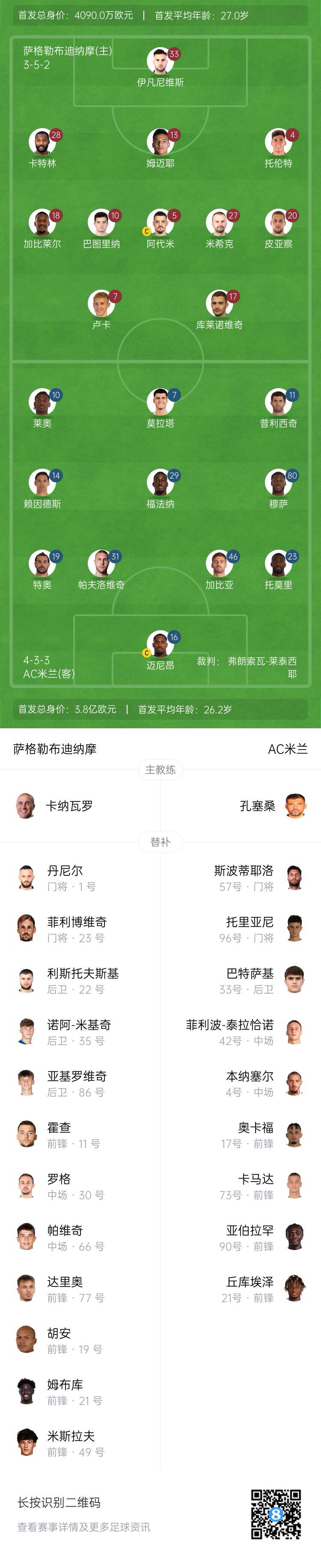 米蘭替補:57-斯波蒂耶洛、96-托里亞尼、4-本納塞爾、17-奧卡福、21-丘庫埃澤、33-巴特薩基、42-泰拉恰諾、73-卡馬達、90-亞伯拉罕